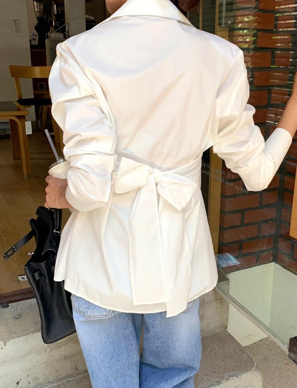 襟付きで前開きのボタンスタイルは、重ね着風に着こなすことができ、バックのリボンが女性らしさを引き立てます。