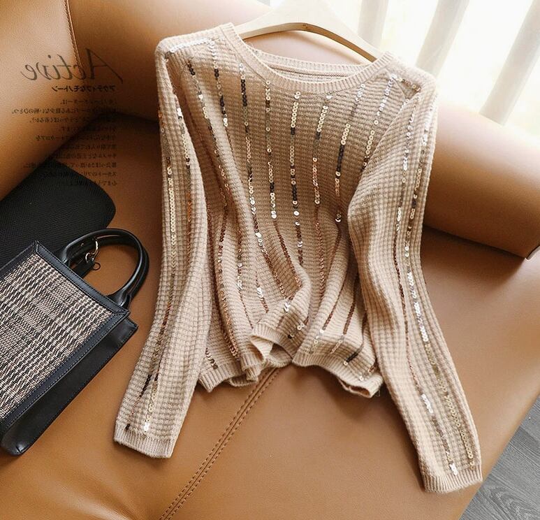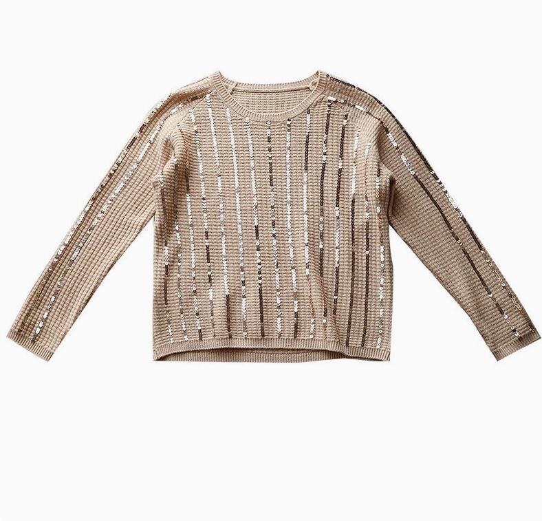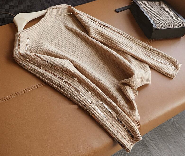 レディース トップス ニット プルオーバー 普通丈 長袖 ラウンドネック 襟なし ストレート フェミニン スパンコール 大人可愛い きれいめ シンプル カジュアル おしゃれ かっこいい エキゾチック こなれ感 ラフ 個性的 クール モダン 主役級 存在感 ベーシック ナチュラル 無地 秋 10代 20代 30代 40代 デート お出かけ 女子会 休日 ショッピング カフェ 普段使い 着回し モテ トレンド 流行 インスタ映え 定番 M L ホワイト グレー ベーシックカラー 大人カラー キャメル カラバリ