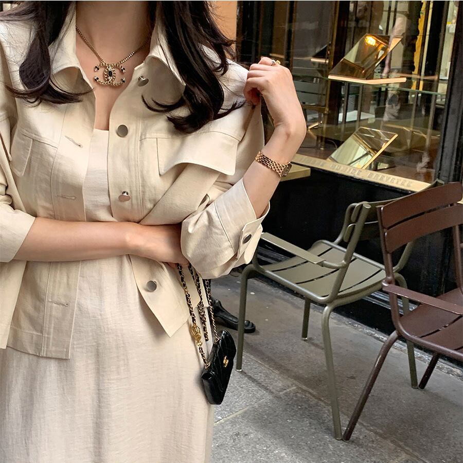 前開きのボタンデザインや胸ポケットのアクセントが、可愛さと上品さを両立。