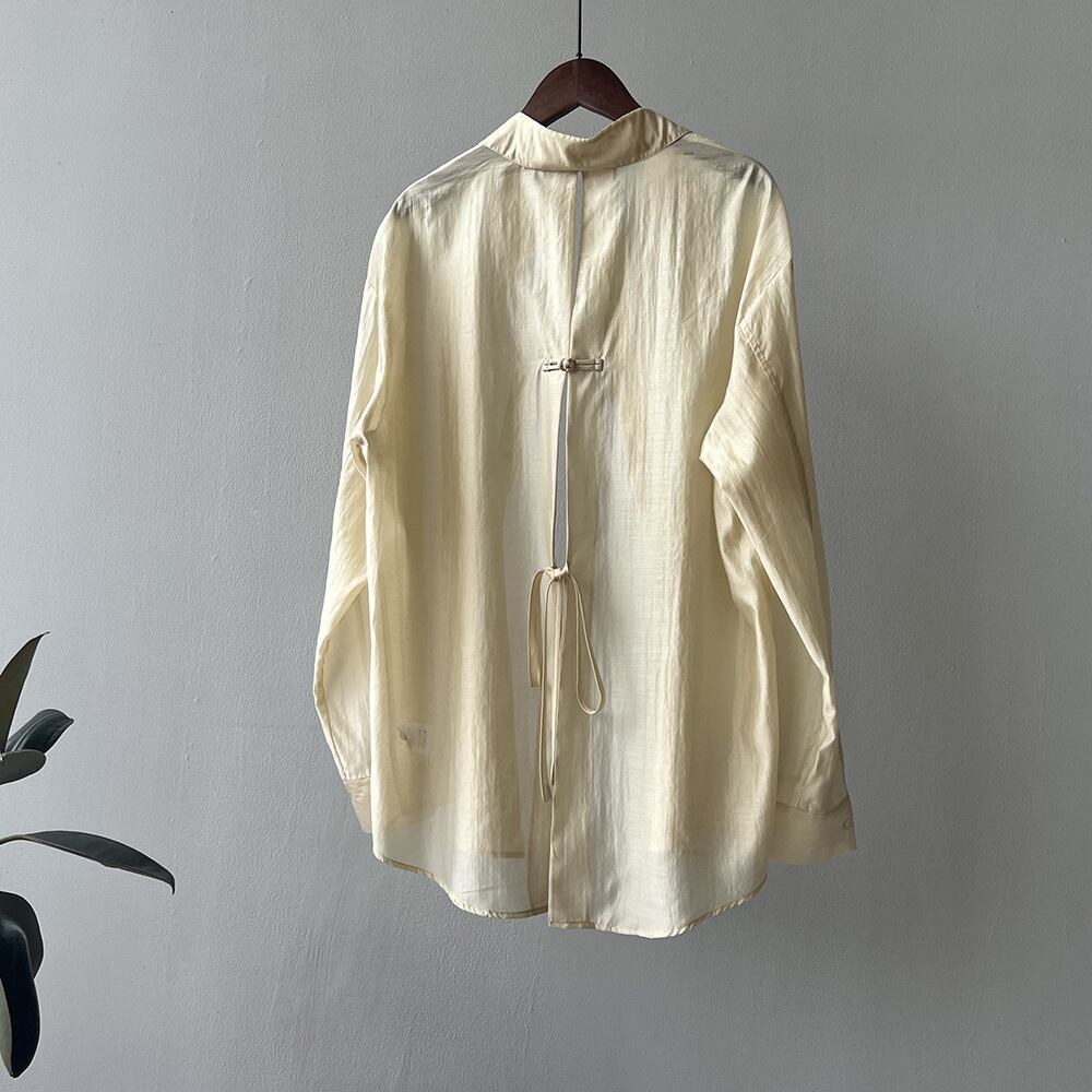トップス シャツ 長袖 襟付き 前開き ボタン バックスリット バックリボン シースルー 薄手 かわいい 大人可愛い きれいめ シンプル 上品 おしゃれ かっこいい カジュアル こなれ感 個性的 主役級 ルーズ 存在感 抜け感 春 夏 ベーシック ナチュラル キュート クール 無地 女性用 レディース ママ OL 通勤 オフィス 学生 通学 デート お出かけ お泊まり 女子会 旅行 休日 アウトドア カフェ ショッピング コンパ レストラン イベント 普段使い デイリー 着回し 重ね着 M L トレンド