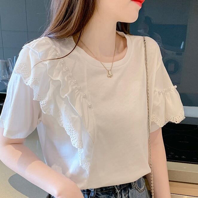 大人可愛いスタイルを楽しみたいあなたにぴったりの、フリルとフェイクパールをあしらったラウンドネックのTシャツです。