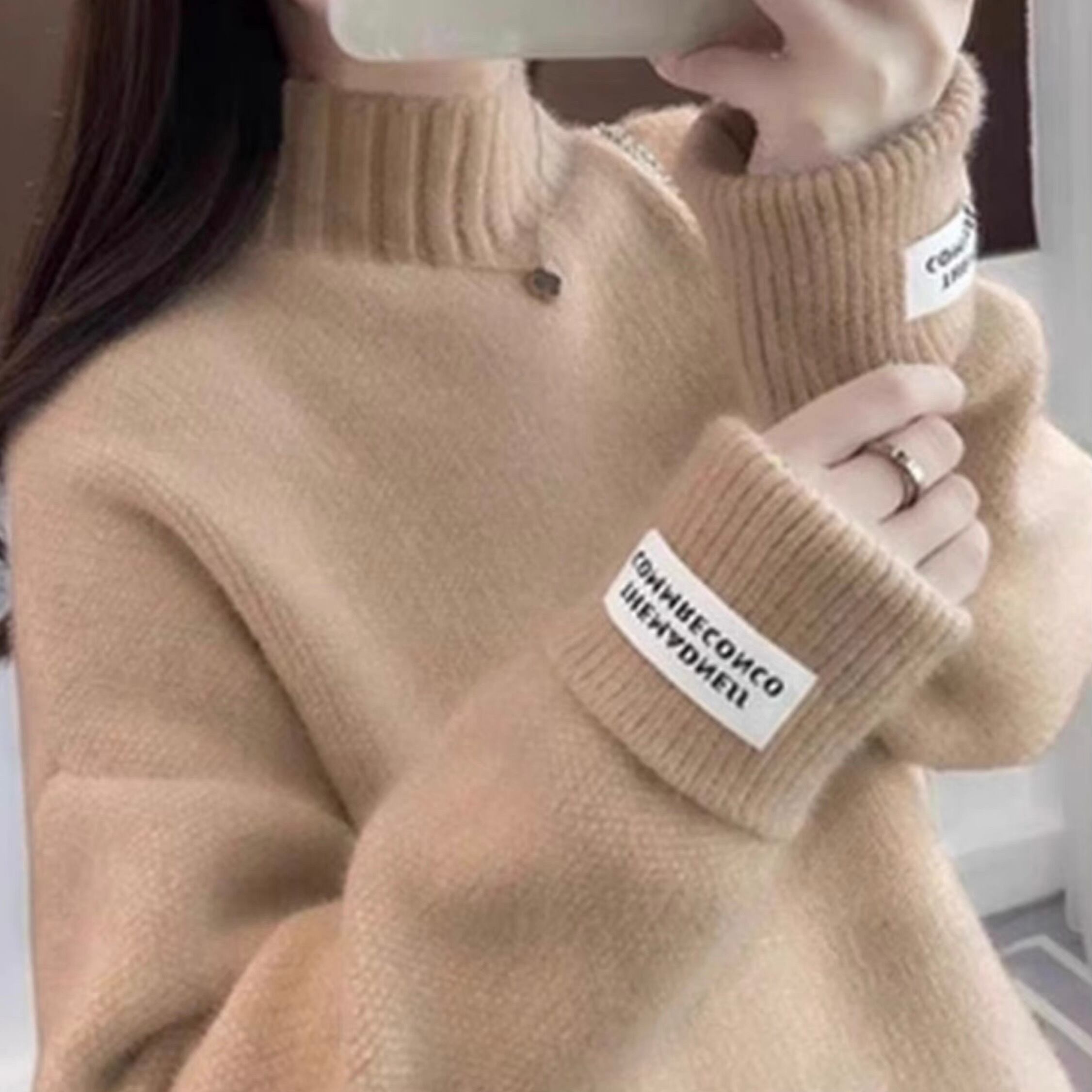 袖口のタグがアクセント、さりげなく個性をプラスするハイネックニット。