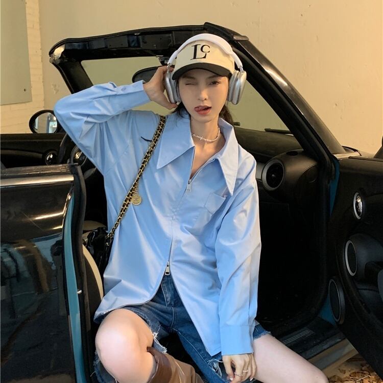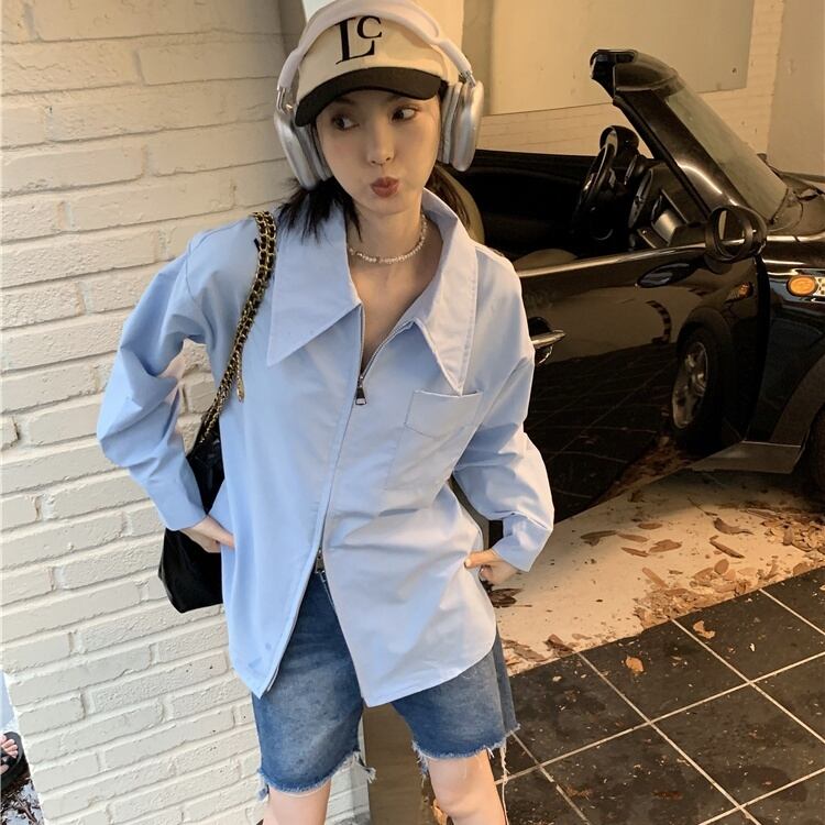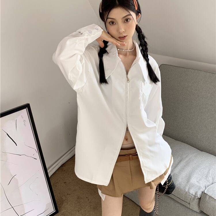 トップス シャツ 長袖 襟付き 前開き ファスナー 胸ポケット ミディアム丈 サイドスリット かわいい 大人可愛い きれいめ シンプル 上品 おしゃれ かっこいい カジュアル こなれ感 個性的 主役級 存在感 抜け感 ラフ ルーズ 春 夏 ベーシック ナチュラル クール メンズライク 無地 女性用 レディース ママ OL 通勤 オフィス 学生 通学 デート お出かけ お泊まり 女子会 旅行 休日 カフェ ショッピング アウトドア イベント 普段使い デイリー 着回し 重ね着 S M L XL トレンド