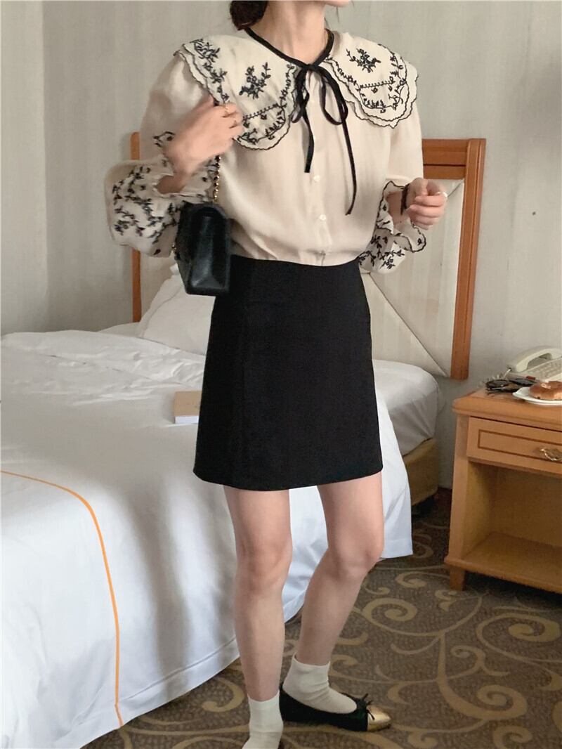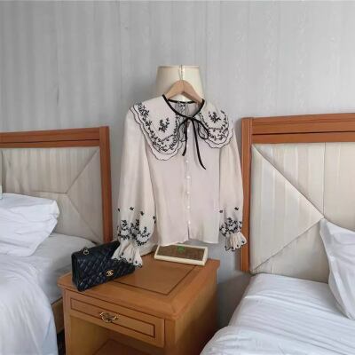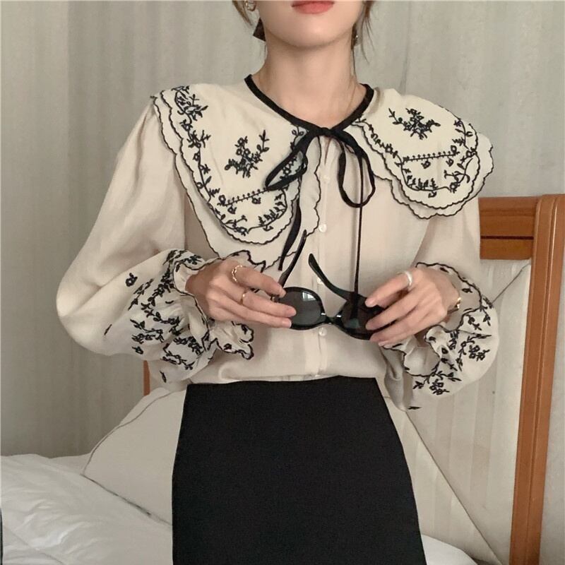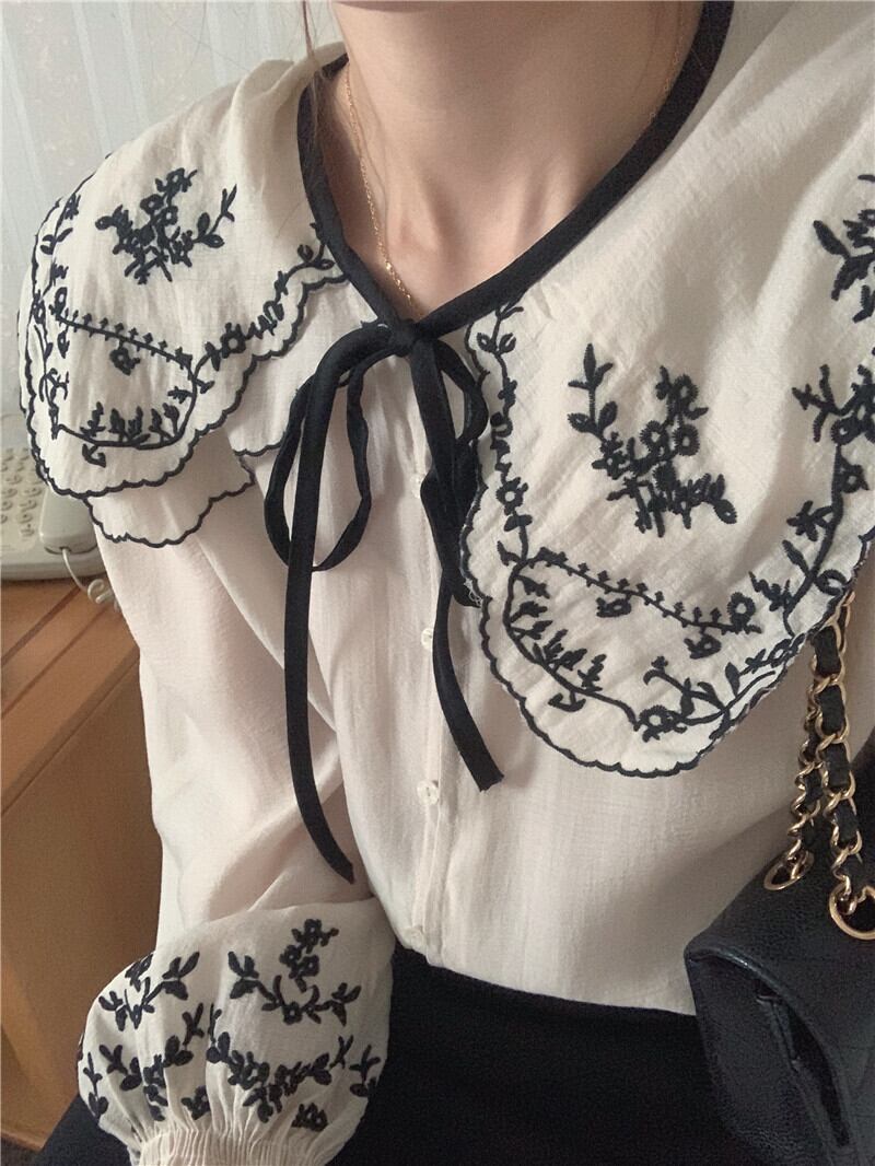 トップス シャツ ブラウス 長袖 襟付き 前開き ボタン ビックカラー 刺繡 リボン 薄手 かわいい 大人可愛い きれいめ シンプル 上品 おしゃれ かっこいい カジュアル こなれ感 個性的 主役級 存在感 抜け感 春 夏 ベーシック ナチュラル フェミニン ガーリー エレガント 無地 女性用 レディース ママ OL 通勤 オフィス 学生 通学 デート お出かけ お泊まり 女子会 旅行 休日 カフェ ショッピング アウトドア イベント 普段使い デイリー 着回し 重ね着 ワンサイズ モテ トレンド