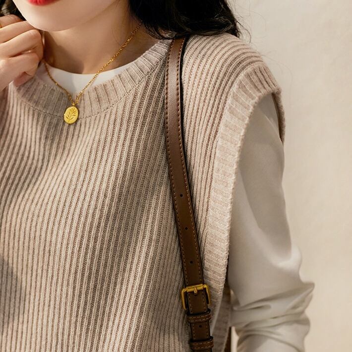 このベストは、ラウンドネックでシンプルかつ上品なデザインが特徴です。