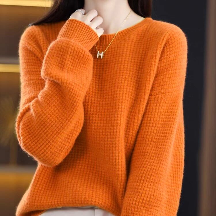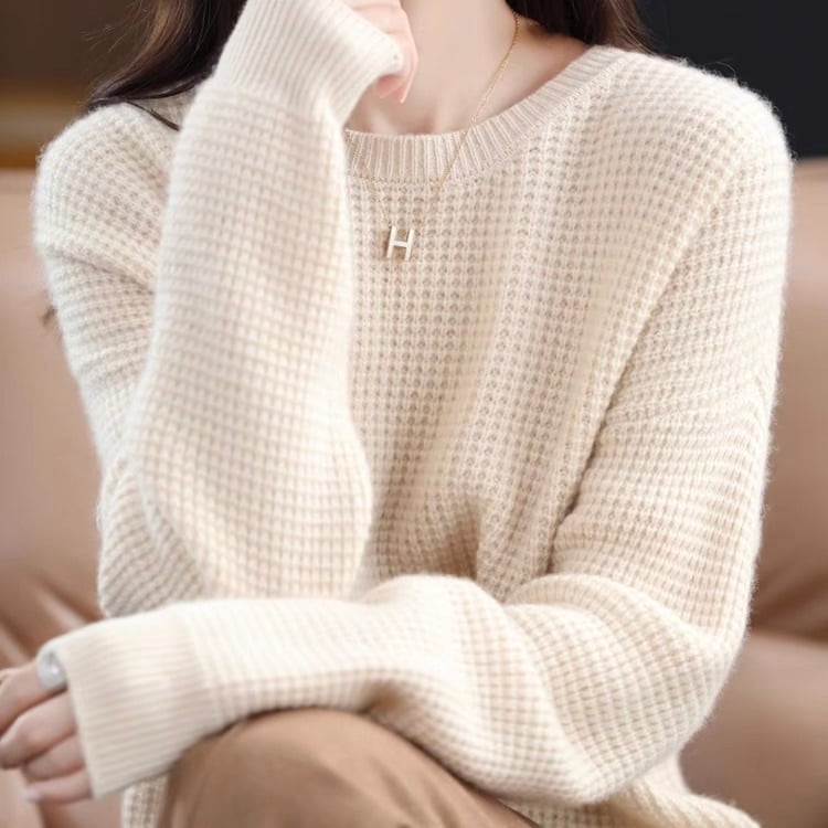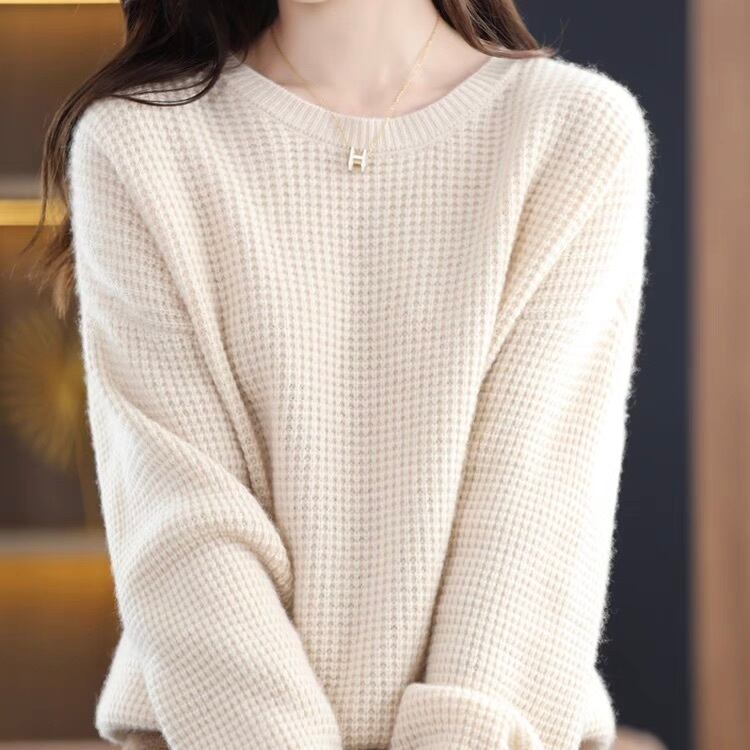 ワッフル模様が可愛いゆったりシルエットのニットトップス。