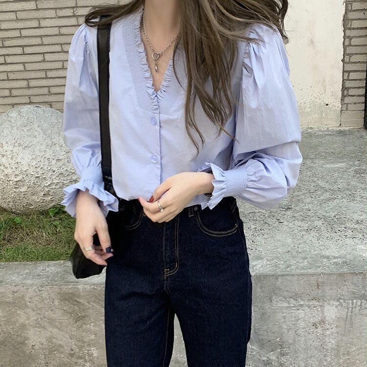 レディース トップス シャツ ブラウス 前開き 長袖 ボリューム袖 パフスリーブ フリル袖 Vネック フェミニン フリル ボタン ヴィンテージ かわいい 大人可愛い きれいめ 上品 おしゃれ レトロ ガーリー エレガント 主役級 存在感 抜け感 ラブリー キュート ロリータ プリンセス ラグジュアリー クラシカル ロマンティック ナチュラル 無地 春 秋 デート お出かけ イベント 女子会 休日 ショッピング カフェ 重ね着 着回し レイヤード トレンド 流行 S M L XL 白 ホワイト 水色 ブルー
