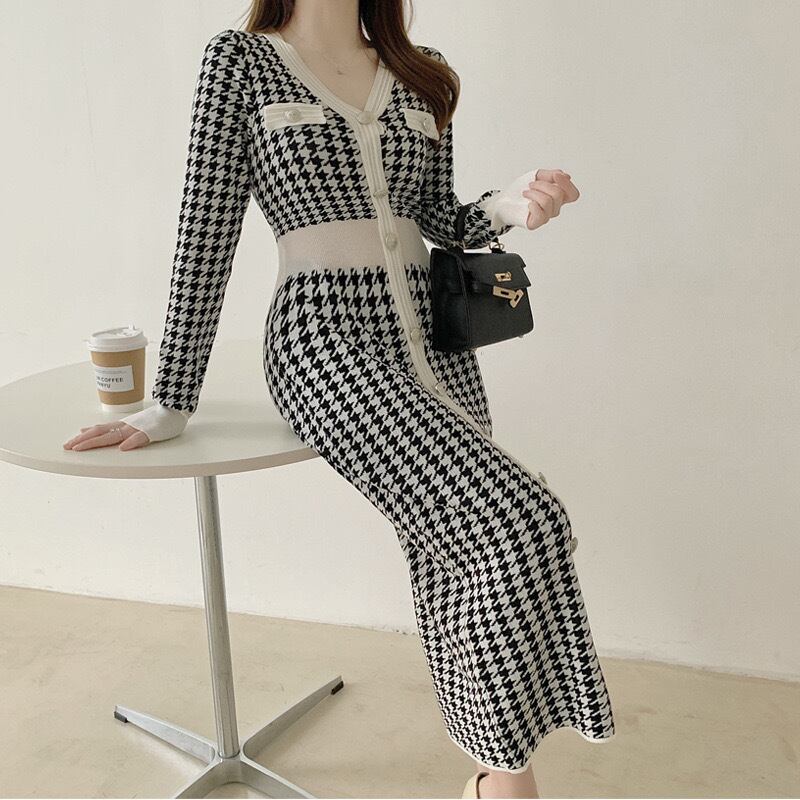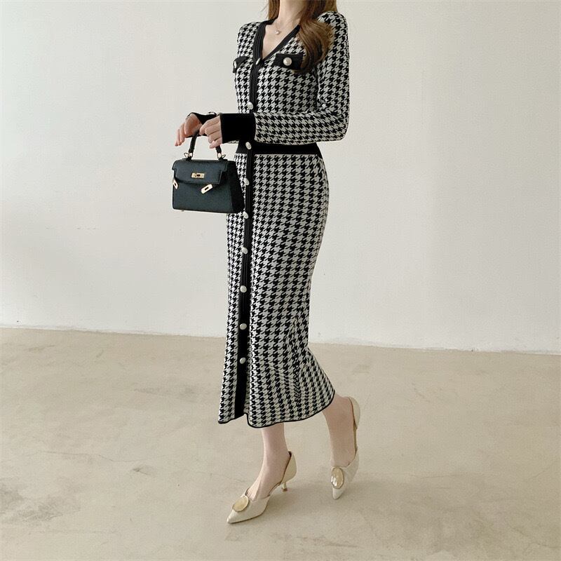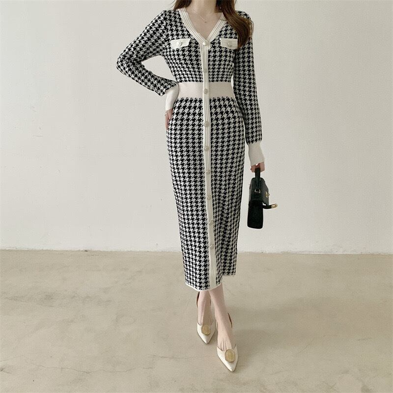 レディース スカート ワンピース ニット セーター ニットワンピ タイトスカート ニットスカート ペンシルスカート ロングスカート ミモレ ロング ミディアム丈 長袖 Vネック タイト スリム 細身 スマート フェミニン ウエストマーク ハイウエスト ボタン 配色 大人可愛い きれいめ 上品 おしゃれ エレガント クラシカル ロマンティック レディライク 千鳥格子 春 秋 冬 二次会 授業参観 ママ 20代 30代 40代 OL 通勤 デート ショッピング コーデ 脚長 S M L ホワイト ブラック 黒