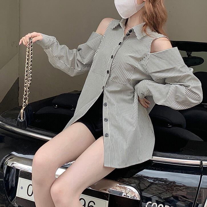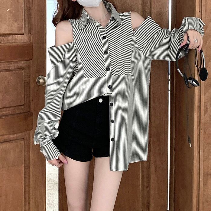 レディース トップス シャツ ブラウス 前開き ロング カットオフ 長袖 Vネック オフショルダー 襟付き 角襟 フェミニン ストリート ボタン かわいい 大人可愛い カジュアル おしゃれ かっこいい こなれ感 ラフ ガーリー ルーズ 個性的 クール モード系 主役級 存在感 抜け感 キュート 都会的 アクティブ ストライプ 春 秋 デート お出かけ イベント 休日 ショッピング コンサート ライブ 重ね着 韓国 オルチャン 楽ちん 普段使い 着回し トレンド 流行 インスタ映え S M L 黒 ブラック