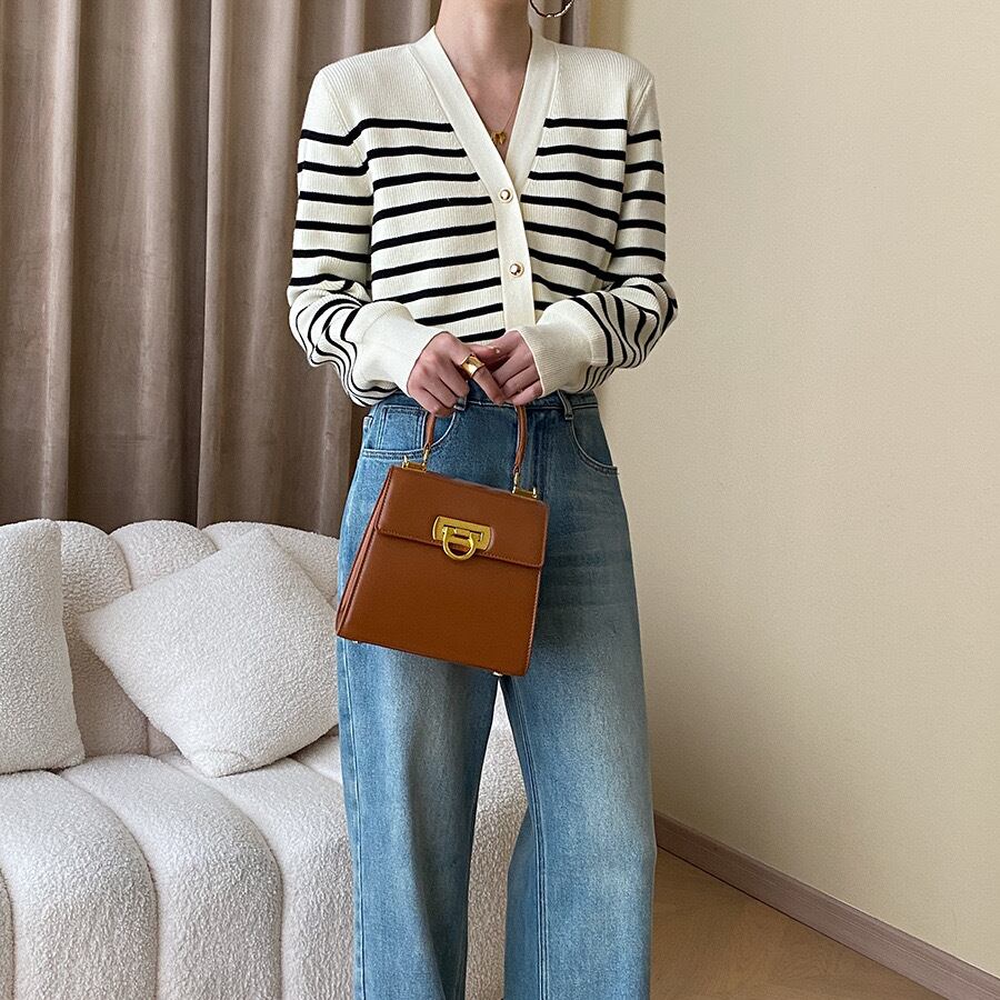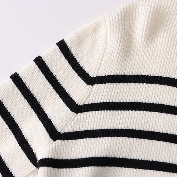 ストライプ柄がアクセントになり、きれいめカジュアルなスタイルにぴったりです。