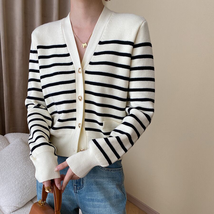 レディース トップス ニット セーター カーディガン 上着 羽織 前開き タックイン 裾イン 長袖 Vネック フェミニン リブ リブニット 伸縮性 ボタン アメカジ 配色 大人可愛い シンプル カジュアル おしゃれ かっこいい こなれ感 ラフ 抜け感 クラシカル アメリカン ナチュラル ボーダー ストライプ 春 秋 冬 ママ 10代 20代 30代 40代 OL 通勤 学生 通学 デート お出かけ 休日 ショッピング カフェ モノトーン コーデ 着回し 定番 M L 黒 ブラック アプリコット 大人カラー