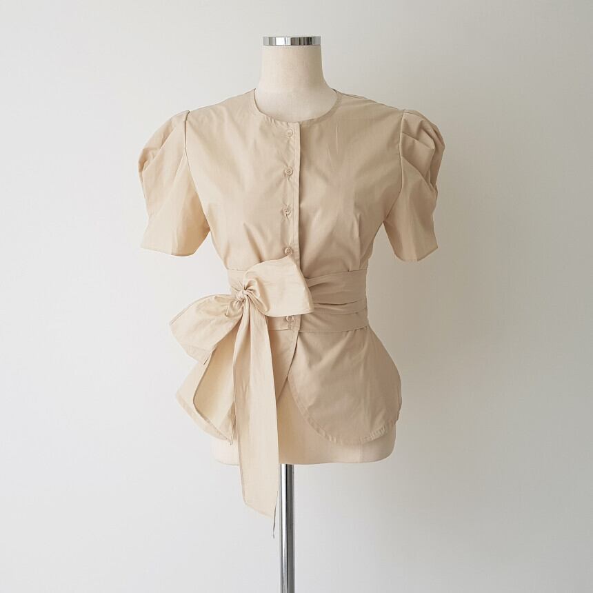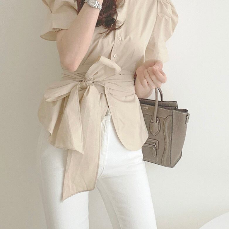 レディース トップス シャツ ブラウス 半袖 パフスリーブ ラウンドネック タイト スリム 細身 フェミニン リボン ウエストマーク ウエストリボン バックリボン ハイウエスト 前開き かわいい 大人可愛い きれいめ 上品 おしゃれ こなれ感 ガーリー エレガント モダン 抜け感 ラブリー キュート ロマンティック ナチュラル 無地 デート お出かけ パーティー イベント 旅行 レストラン 女子会 休日 韓国 オルチャン 普段使い 着回し 清楚 トレンド 流行 インスタ映え S M 白 ホワイト ベージュ