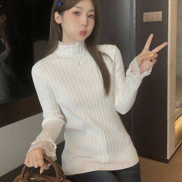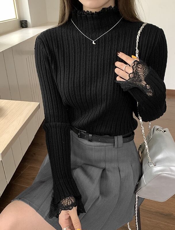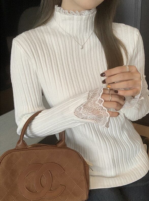 トップス カットソー 長袖 ハイネック プルオーバー ミディアム丈萌え袖 レース 重ね着風 かわいい 大人可愛い きれいめ シンプル 上品 おしゃれ かっこいい カジュアル こなれ感 個性的 主役級 存在感 抜け感 ベーシック ナチュラル ガーリーフェミニン エレガント 無地 女性用 レディース ママ OL 通勤 オフィス 学生 通学 デート お出かけ お泊まり 女子会 旅行 休日 カフェ ショッピング イベント パーティー 二次会 重ね着 普段使い デイリー 着回し S M L モテ トレンド