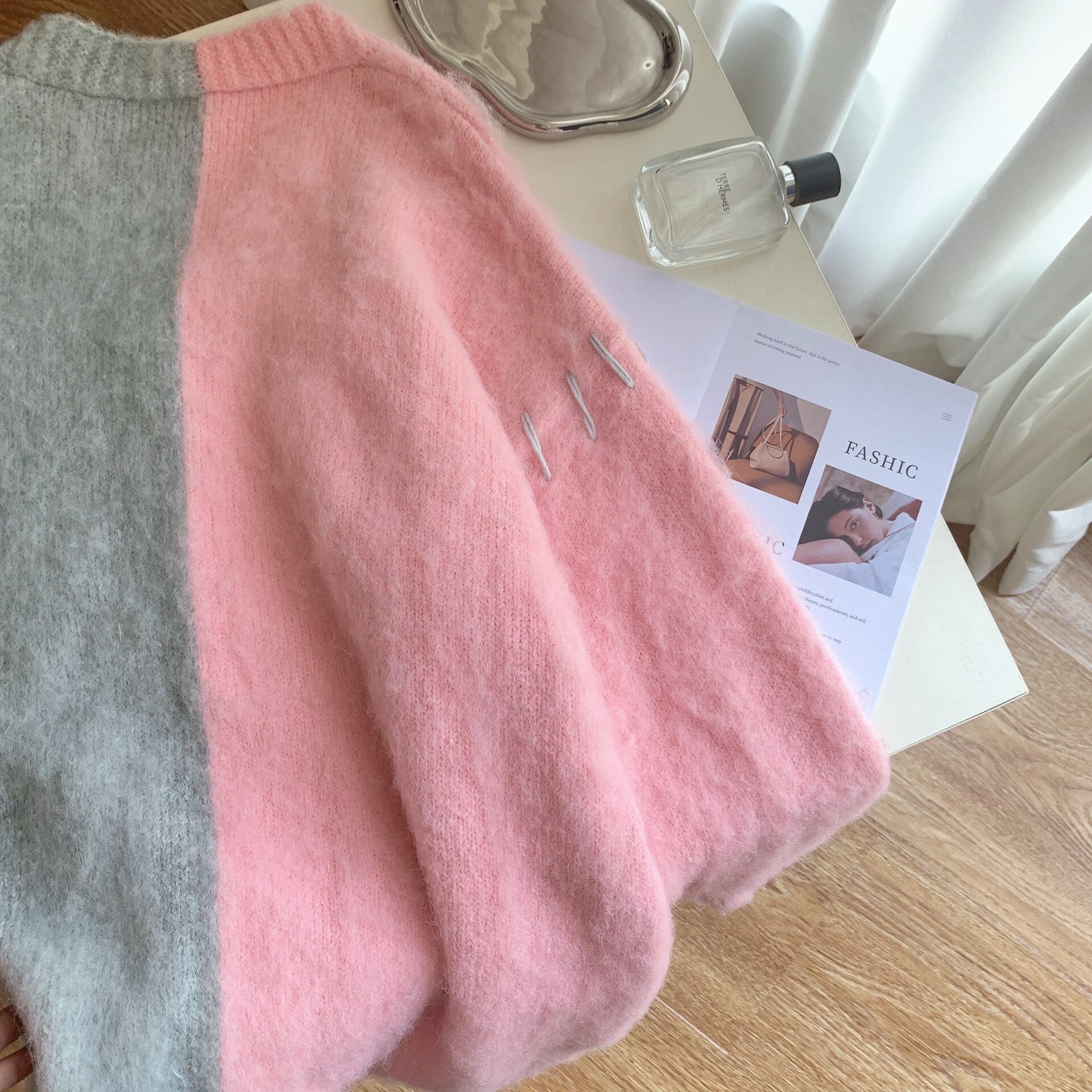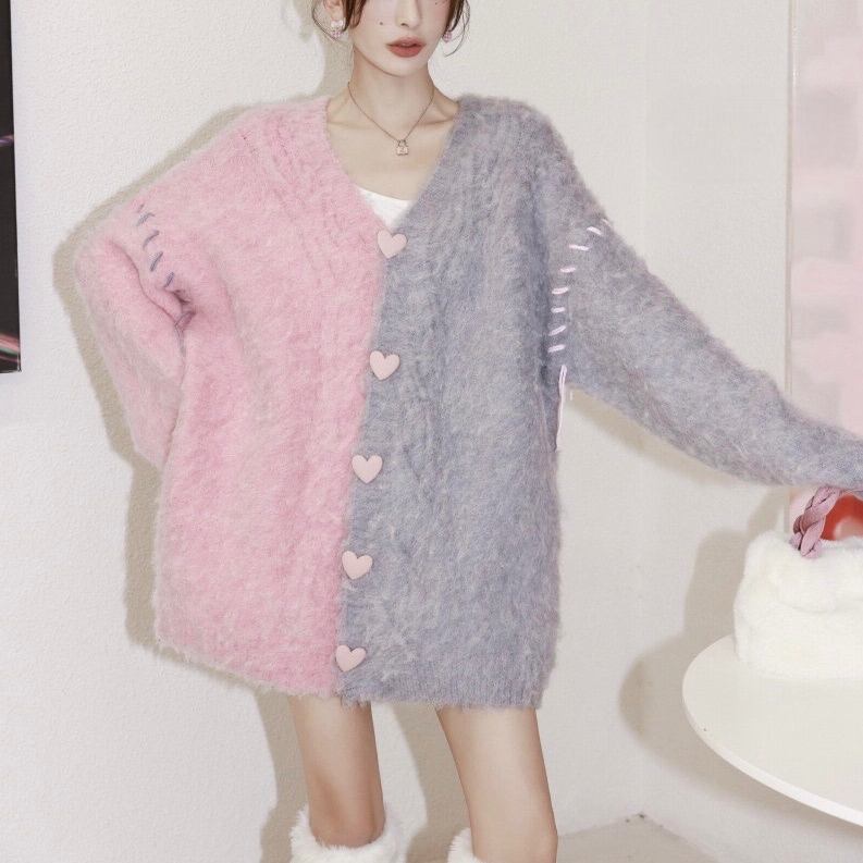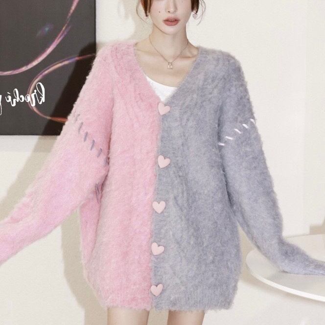 レディース トップス ニット セーター カーディガン 前開き 長袖 Vネック オーバーサイズ フェミニン ストリート ボタン かわいい 大人可愛い カジュアル おしゃれ レトロ 主役級 存在感 抜け感 ヴィンテージ ラブリー キュート ロリータ プリンセス ロマンティック 秋 冬 お出かけ イベント 重ね着 お揃い 双子 韓国 オルチャン 楽ちん 暖かい 防寒 体型カバー 普段使い 着回し トレンド 流行 インスタ映え 大きいサイズ ビッグ ゆったり ゆる フリーサイズ グレー ピンク バイカラー