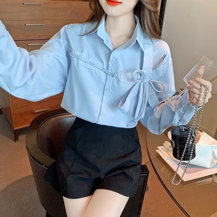 レディース トップス シャツ ブラウス 前開き アシンメトリー 長袖 フェミニン ストリート リボン ボタン かわいい 大人可愛い おしゃれ かっこいい こなれ感 ガーリー ルーズ 個性的 クール モード系 主役級 存在感 抜け感 ラブリー キュート プレッピー アクティブ ロマンティック ナチュラル 無地 デート お出かけ イベント 女子会 休日 コンサート ライブ フェス 重ね着 韓国 オルチャン 普段使い トレンド 流行 インスタ映え フリーサイズ 白 ホワイト クリーム 水色 ブルー パステル