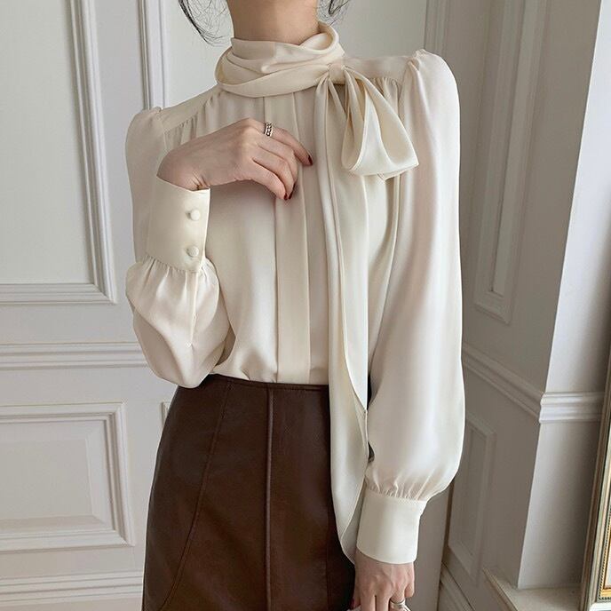 上品なハイネックにリボンタイが揺れるクラシカルでエレガントなブラウス。