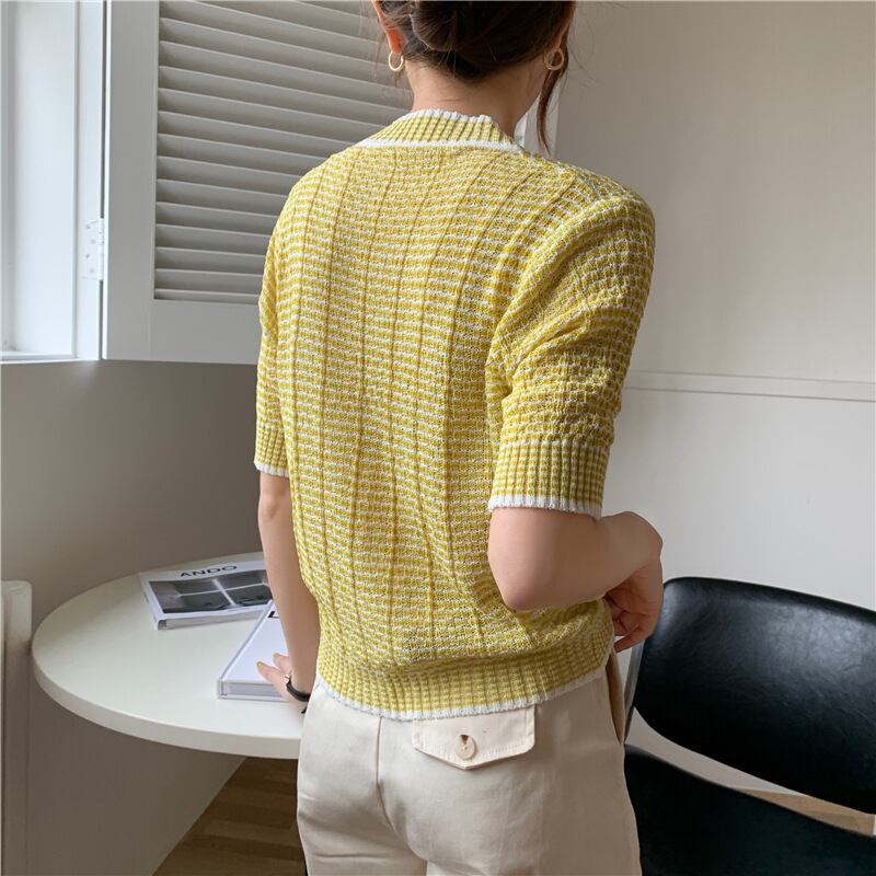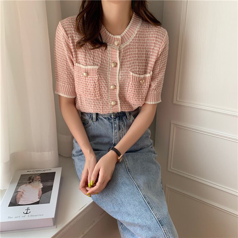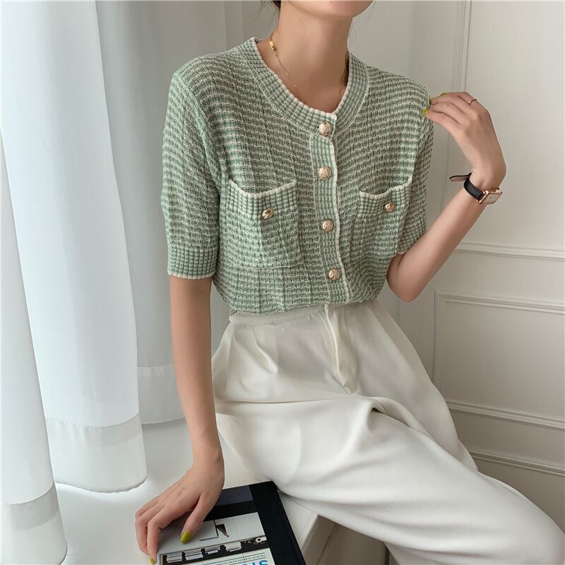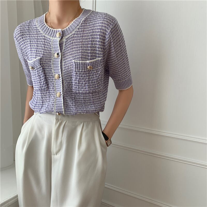 レディース トップス カーディガン サマーセーター サマーニット 半袖 ラウンドネック フェミニン ボタン ヴィンテージ かわいい 大人可愛い きれいめ シンプル 上品 おしゃれ レトロ こなれ感 ガーリー エレガント 抜け感 かっちり ラブリー キュート 都会的 クラシカル ナチュラル 夏 デート お出かけ リゾート 旅行 女子会 休日 ホテル ショッピング カフェ 韓国 オルチャン 楽ちん 普段使い 着回し トレンド 流行 インスタ映え 定番 M L 紫 黄色 イエロー ピンク 緑 グリーン パープル