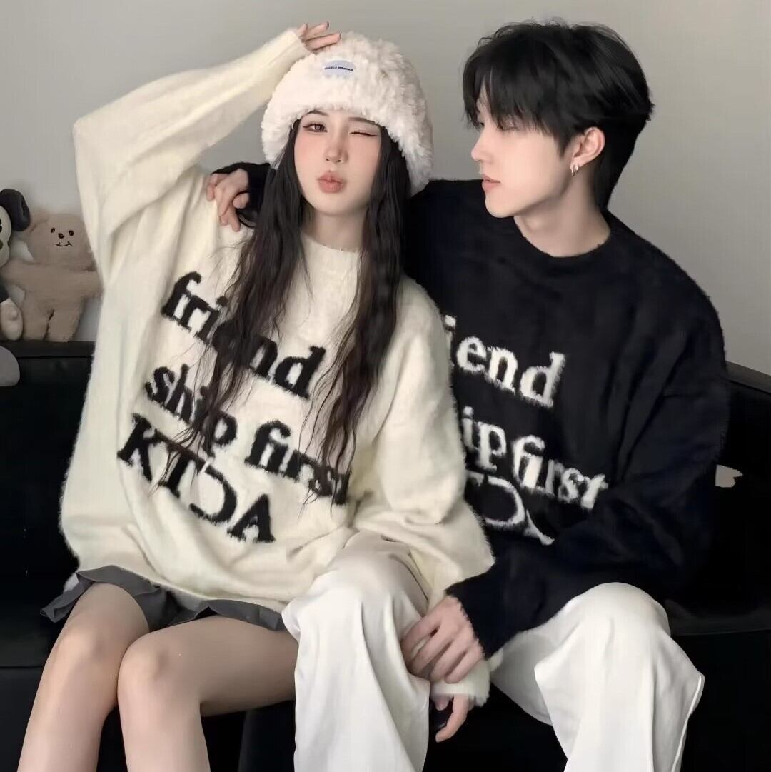 トップス ニット セーター プルオーバー 長袖 ドロップショルダー 萌袖 ラウンドネック クルーネック ストリート ルーズフィット バイカラー かわいい 大人可愛い シンプル カジュアル おしゃれ かっこいい こなれ感 ラフ ルーズ 主役級 存在感 抜け感 ベーシック ナチュラル 無地 ロゴ 冬 ペア 男女兼用 ユニセックス カップル デート お出かけ 旅行 女子会 休日 ショッピング カフェ モノトーン お揃い 普段使い 着回し M L XL 2XL アプリコット ブラック
