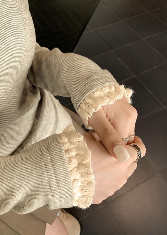 萌え袖仕様のプルオーバーは、レース重ね着風のデザインが魅力的で、シンプルながらも上品さが引き立ちます。