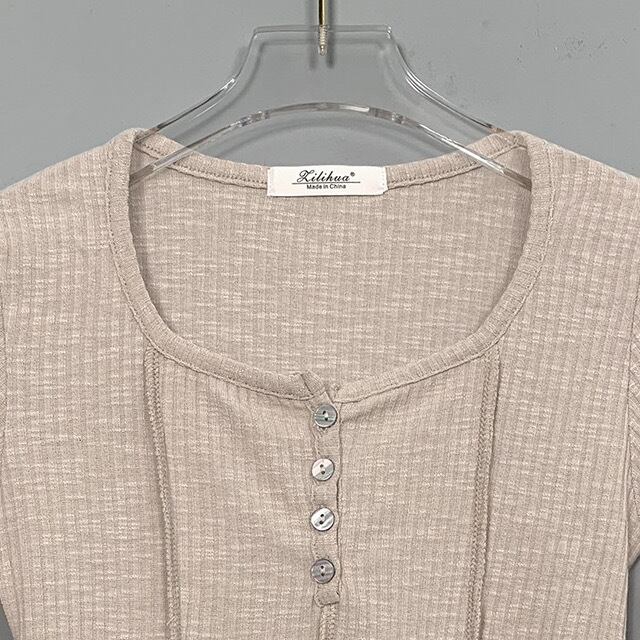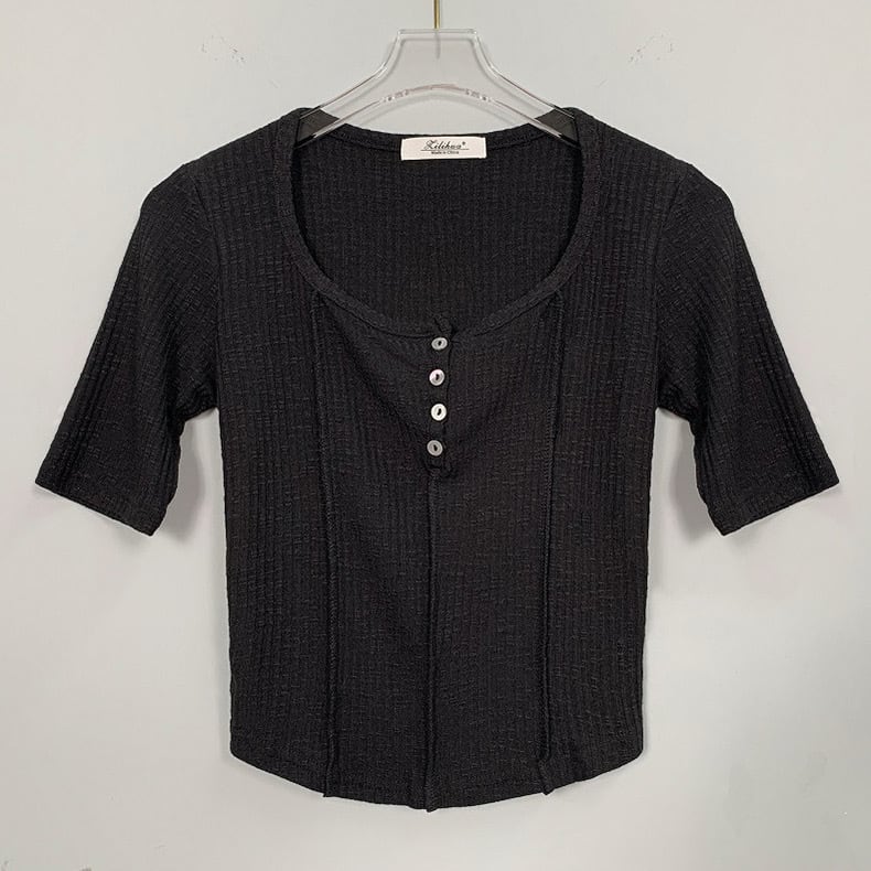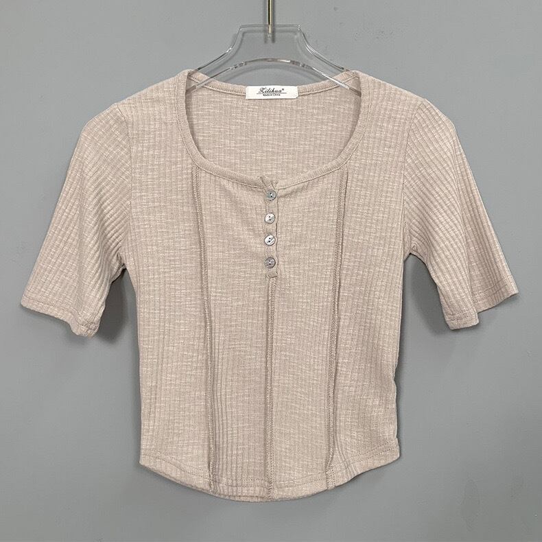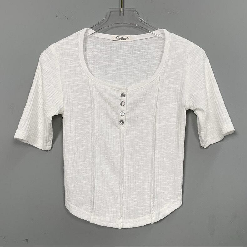 レディース トップス カットソー Tシャツ ショート クロップド丈 半袖 スクエアネック ヘンリーネック 鎖骨 デコルテ タイト スリム 細身 ストリート ハイウエスト リブ 伸縮性 ボタン アメカジ ステッチ ラウンドヘム シンプル カジュアル おしゃれ かっこいい 個性的 クール アメリカン セクシー 無地 春 夏 10代 20代 30代 40代 お出かけ 公園 休日 ショッピング クラブ 韓国 コーデ 脚長 普段使い トレンド 流行 フリーサイズ 白 ホワイト 黒 ブラック ベージュ 大人カラー