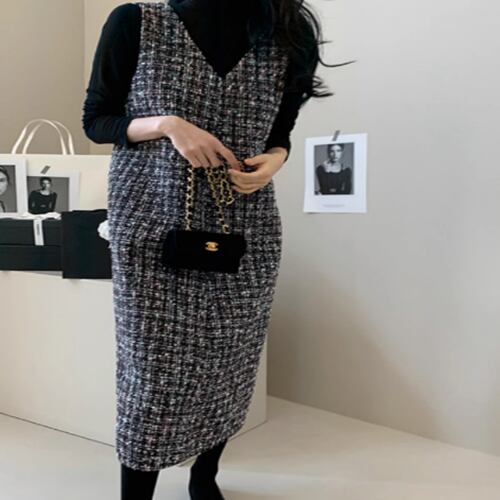 レディース ワンピース ミモレ丈 袖なし ノースリーブ Vネック 襟なし ワイド フェミニン バックスリット ツイード きれいめ シンプル カジュアル 上品 おしゃれ こなれ感 ラフ エレガント モダン 主役級 存在感 都会的 ベーシック ナチュラル 無地 秋 冬 10代 20代 30代 デート お出かけ 女子会 休日 ショッピング カフェ モノトーン 重ね着 コーデ 楽ちん モテ トレンド 流行 インスタ映え 定番 M L XL 2XL 3XL 4XL ブラック ベーシックカラー 大人カラー