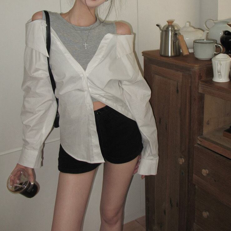 レディース トップス シャツ レギュラー丈 タックイン 裾イン 長袖 ドロップショルダー オープンショルダー オフショルダー ラウンドネック 襟付き 切り替え ドッキング ボタン 切り替えデザイン 落ち感 大人可愛い シンプル カジュアル おしゃれ かっこいい ラフ ルーズ 個性的 クール アメリカン ワイルド ギャル セクシー 無地 春 秋 10代 20代 30代 40代 学生 お出かけ 女子会 休日 ショッピング 重ね着 韓国 コーデ 普段使い レイヤード トレンド 流行 フリーサイズ 白 ホワイト