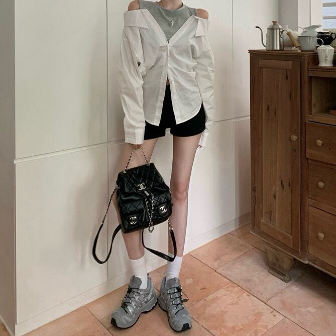 ショート丈ノースリーブ×ホワイトシャツを合わせたレイヤード風デザインです。