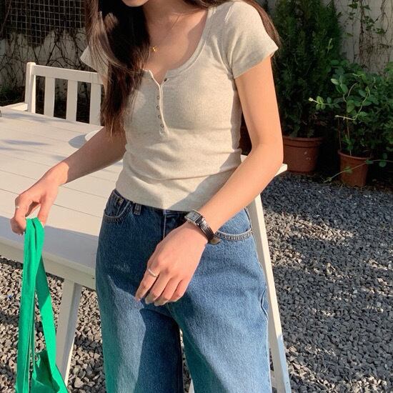レディース トップス カットソー Tシャツ ショート クロップド丈 半袖 スクエアネック ヘンリーネック 鎖骨 デコルテ タイト スリム 細身 ストリート ハイウエスト リブ 伸縮性 ボタン アメカジ シンプル カジュアル おしゃれ かっこいい 個性的 クール アメリカン セクシー 無地 春 夏 10代 20代 30代 40代 お出かけ 公園 休日 ショッピング アクティブ 韓国 コーデ 脚長 普段使い トレンド 流行 S M L XL 白 ホワイト 黒 ブラック ダークグレー ピンク ライトグレー