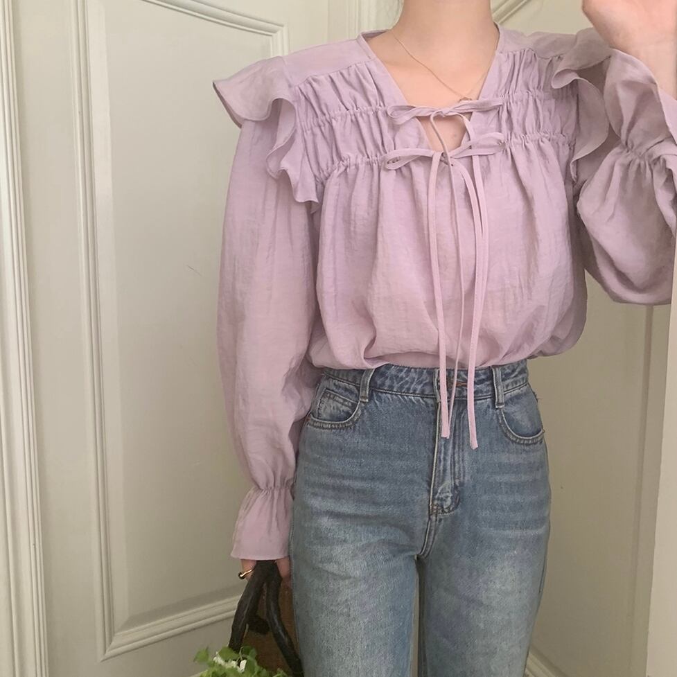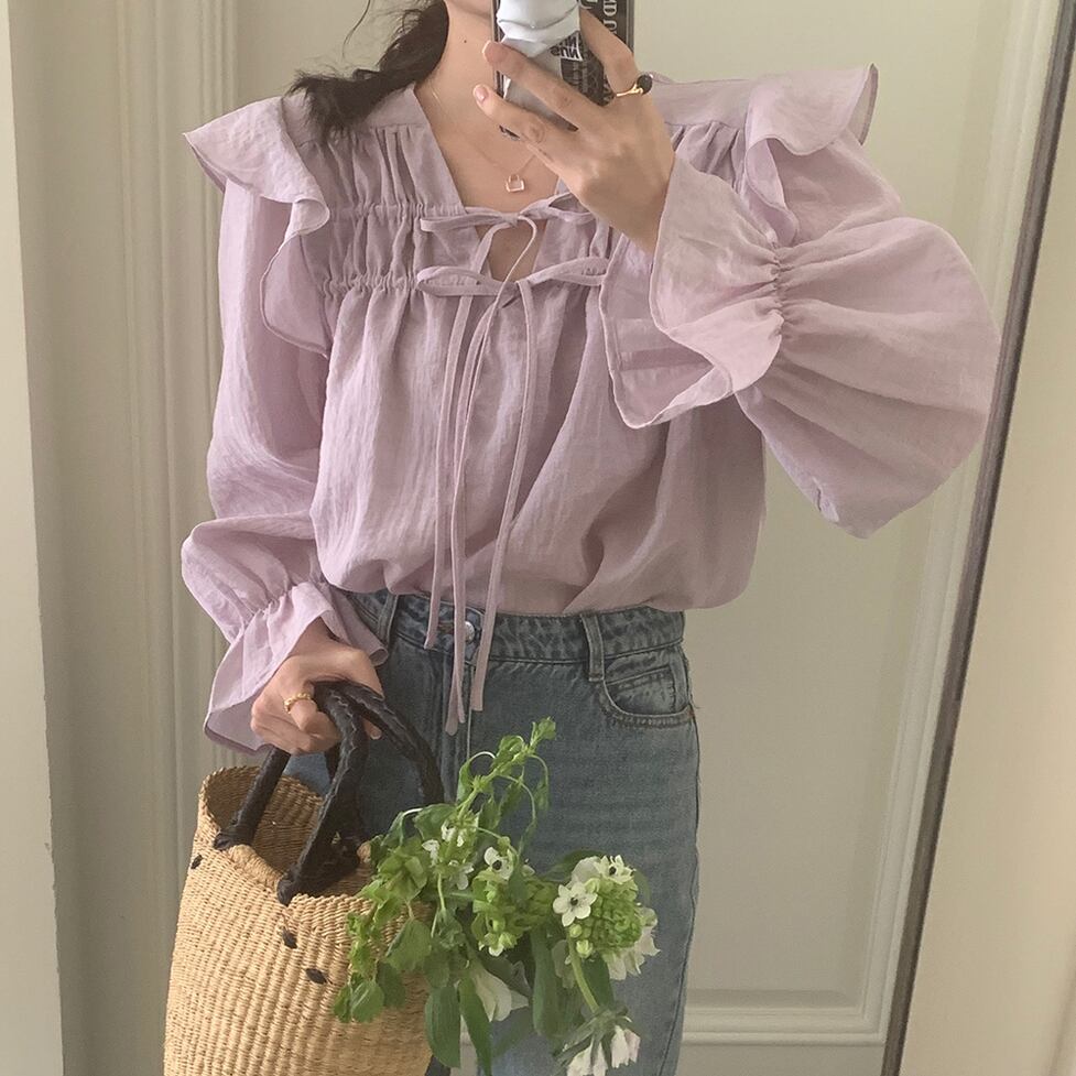 シアーな素材で軽やかさを後押ししたフリルとリボンが女性らしいブラウス。どう転ばせてもブレない好感度でキレイなままさらに洗練度が高く。高揚感が得られるメリットがあるオシャレの軸になるアイテム