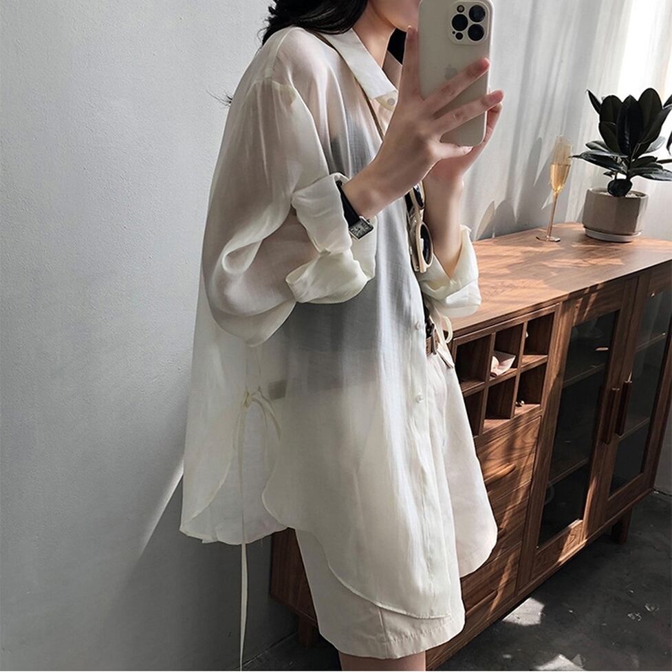 インナーとのコントラストを楽しめる透け感がクールなシャツブラウス。どう転ばせてもブレない好感度でキレイなままさらに洗練度が高く。高揚感が得られるメリットがあるオシャレの軸になるアイテム
